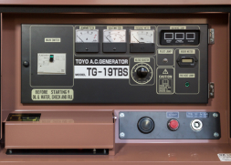 Все электростанции TOYO имеют практичную и удобную панель управления. На панели управления справа есть защищенный терминал подключения кабелей нагрузки с защитным автоматом при перегрузке. Для контроля подключенной нагрузки, в центре есть аналоговые приборы измерения тока и частоты, а также подстроченный потенциометр регулировки выходного напряжения. В правой части приборной панели присутствует аварийная сигнализация защиты двигателя, световые индикаторы давления масла, температура охлаждающей жидкости и работа зарядного генератора АКБ. Под аварийными индикаторами расположен электронный счетчик мото часов наработки электростанции, индикатор работы свечей предпускового накаливания и пилотную лампу работы альтернатора переменного тока. В самом низу расположена кнопка аварийной остановки и разъем ключа зажигания.